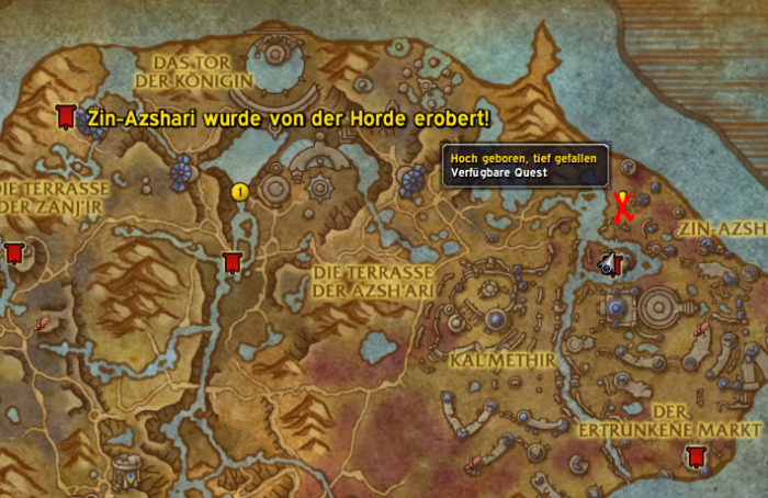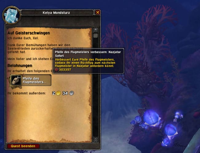 Zu guter Letzt müssen wir nur noch zu Kelya nach Zin-Azshari zurück, und erhalten dort unsere Nazjatar-Aufwertung für die Pfeife des Flugmeisters. Außerdem erhalten wir bei Kelya auch noch einen weiteren Flugpunkt, da sie uns als Dank als Flugmeister dient.
